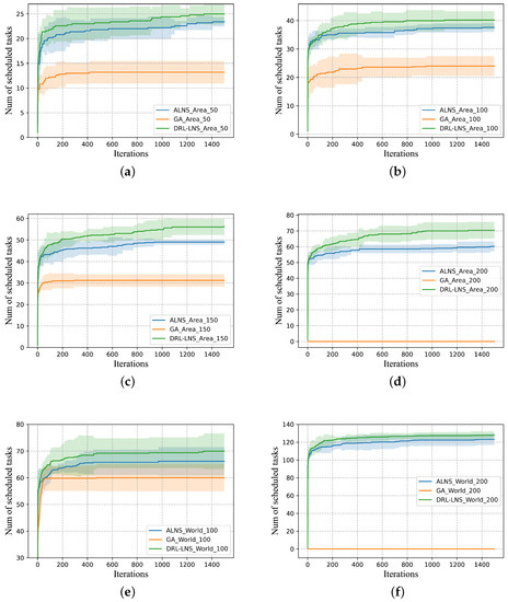 Figure 5b exhibits a similar trend to the scenario. Due to the increase in the number of tasks and the expansion of the coverage area, the model for the “World” scenario generally approaches convergence after 4000 iterations, which is considerably more than the “Area” scenario. Additionally, in the seed sensitivity experiments, it was observed that the “World” scenario is much more sensitive to the random seed settings compared with the “Area” scenario, particularly for the instance with a task count of 100. This sensitivity is particularly pronounced for the instance with 100 tasks, where the planning rate notably increases for two specific random seed settings. As a result, the average task planning rate for instance 100 is considerably higher than instances with larger numbers of tasks. For subsequent validation experiments, we employed a consistent random seed across scenarios.