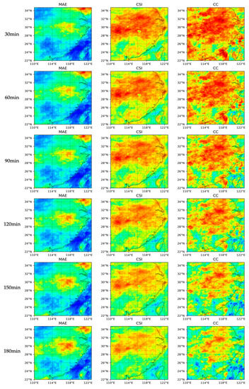 The spatial distributions of the metrics over time for the precipitation forecasting results of MCSPF-Net are shown in Figure 9, using MAE, CSI and CC as the evaluated metrics, respectively. During the evaluation process, the spatial distribution statistics were conducted using the test dataset. The GPM-IMERG Final-Run product was chosen as the true value against which the model forecasting was compared. In Figure 9, the spatial distributions of MAE, CSI and CC for precipitation forecasting results are shown from left to right, and the variation of the metrics from 30 to 240 min of forecast lead times are shown from top to bottom, respectively.