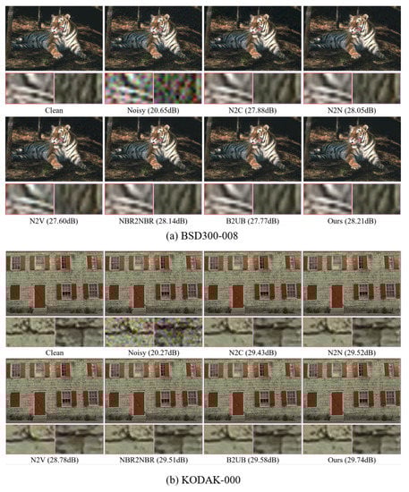 - Batson, J.; Royer, L. Noise2self: Blind denoising by self-supervision. In Proceedings of the International Conference on Machine Learning, Boca Raton, FL, USA, 16–19 December 2019; pp. 524–533. [Google Scholar]