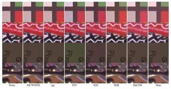 In the real raw-RGB space, Table 2 shows the quality scores for the quantitative comparisons on the SIDD benchmark and SIDD validation. The SIDD website of the SIDD evaluates the quality scores for the SIDD Benchmark. Surprisingly, the proposed method outperforms the state of the art (NBR2NBR) by 0.28 and 0.23 dB for the benchmark and validation. It also outperforms the N2C and N2N by about 0.1 dB. It is worth noting that the unsupervised methods [,] relying on the model prior are significantly less effective when it comes to dealing with real noise, and we even surpass [] by 4.05 and 4.09 dB for the benchmark and validation. Obviously, this type of model prior-based approach is not advisable. The raw-RGB denoising performance in the real world demonstrates that our method is able to simulate complex real noise distributions.