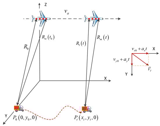 Based on the geometric structure between the radar and the moving target, the instantaneous range from the center of the transmitting channel and the receiving channel to the moving target can be described as follows [,]:
