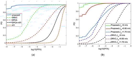 The current work considers that the motion features of the moving target’s components are compatible over the synthetic aperture time. Nevertheless, in experimental conditions, parameters like terrain oscillations, target rotation, and quick maneuvers will degrade the target motion compatibility. Thus, the impact of radial velocity oscillation on identification efficiency should be verified. Figure 3b presents the results of the proposed and DRVC approaches with various velocity standard deviation . As increases, the identification probabilities of the presented detector and DRVC approach reduce. Nevertheless, the decline in the DRVC approach is more significant, indicating that the presented approach has superior speed robustness, and can better adapt to the moving target with inevitable velocity fluctuation.