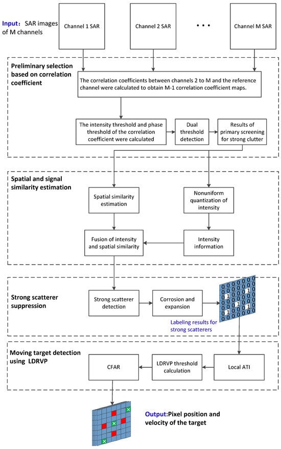 Fortunately, the strong scatterers are mainly artificial (like houses, stationary vehicles, and bridges). Such scatterers’ pixels in the SAR image have a continuous spatial framework, high structure and signal similarity, large amplitude, high inter-channel correlation, and a small interferometric phase [,,]. Therefore, the clutter suppression efficiency can be improved by fusing prior information, such as the scatterers’ spatial structure and the correlation and interferometric phase. In order to realize the mentioned assumption, a two-stage moving target identification approach using scatterers’ spatial structure and signal similarity is presented to resolve the difficulties of high FAP and missing moving targets detected by traditional SAR-GMTI methods in strong scattering scenarios. First, the prior information, such as spatial structure, signal intensity, interferometric phase, and correlation between channels of scatterers, are fused to construct a similarity detector. According to the detection results, the pixel positions of strong scatterers in the scene can be accurately marked to suppress strong clutter. The method considers both the amplitude and the interferometric phase when constructing the similarity detector to avoid the missed detection problem caused by the traditional method of identifying strong moving targets as strong stationary clutter. However, due to the low similarity of the edge of the strong scatterers and the isolated strong scatter to the surrounding pixels, false alarms will be generated after processing in stage I. In order to resolve the issue, the current paper constructs a LDRVP-based detection method using the linear relation between the multi-channel interferometric phases caused by the moving target. The two-stage processing above can efficiently alleviate the FAP and improve the target detection probability.