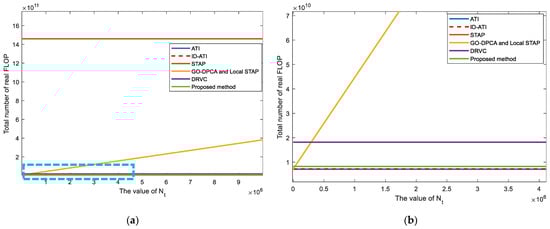 We plot the FLOP curves of six methods according to Table 1 with , , , , , , , and . Figure 5a shows that the computational complexity of STAP is much higher than that of the other five algorithms. The Figure 5b is a local magnification of the blue box area in Figure 5a. It can be seen from Figure 5b that the FLOP number of the proposed algorithm is slightly higher than ATI and ID-ATI [], but all of them are in the order of 109.Therefore, the proposed method does not increase the computational complexity significantly.