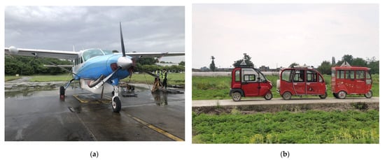 Figure 6a presents the experimental platform. The region illuminated by the radar contains abundant ground properties (such as buildings, country paths, groves, paddy farms, and other physiognomies with different scattering configurations) to further evaluate the presented approach’s adaptability. The experiment employs the three tricycles (as shown in Figure 6b) as the cooperative target to evaluate the presented approach’s efficiency.