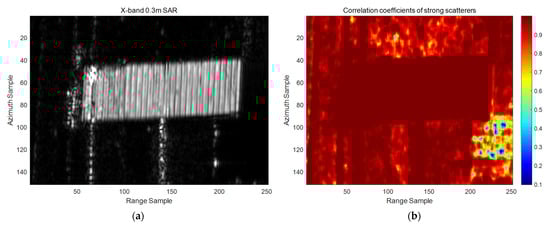 In order to evaluate the capability of the presented approach in preventing the missed detection problem induced by the traditional method of identifying strong moving targets as strong static clutter, an area containing both moving objects and strong clutter was chosen as the research object, as presented in Figure 10a. The pixels with higher intensity in the image are composed of strong clutter and moving targets. Figure 10b presents the DPCA result without strong clutter extraction. It can be seen that the clutter noise ratio of the strong scatterer is close to 25 dB after clutter elimination, indicating that it still has a strong residual energy. Performing CFAR detection directly on it will generate many false alarm targets.