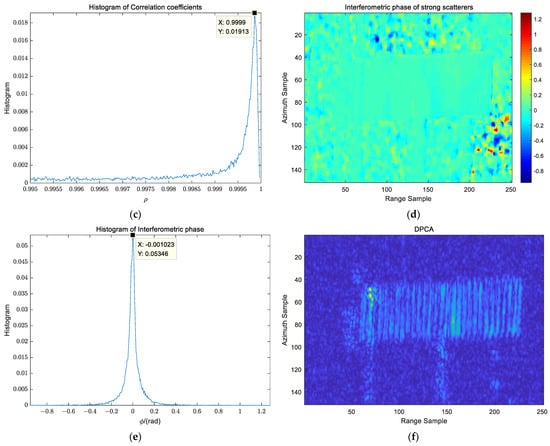 Characteristic analysis of strong scatterers. (a) Strong scatterer; (b) correlation coefficient; (c) the correlation coefficient’s statistical histograms; (d) interferometric phase; (e) statistical histograms of the interferometric phase; (f) the DPCA result.
