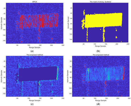 Strong scatterer suppression out moving target region. (a) DPCA test results; (b) strong scatter location extraction results; (c) strong scatterer suppression results of the presented approach; (d) detection results of Stage I.