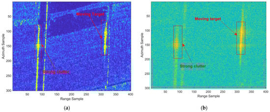 Figure 11c,d describe the clutter suppression results after removing the strong scatterers by the approach in [] and the presented approach, respectively. The presented approach retains the moving target when removing the strong scatterers. Unlike the method in [], the proposed method avoids the problem of erroneously treating strong moving targets as strong clutter, thereby reducing the missed detection probability of moving targets.