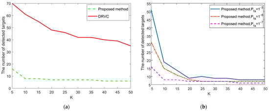 The number of detected targets in the X-band measured data. (a) DRVC and presented approach; (b) the curves of and detected target under different values of Pa.