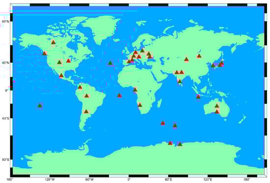 In this study, 37 Multi-GNSS Experiment (MGEX) stations were randomly selected globally for RT PPP processing and RT PPPAR processing using the CNES real-time phase biases product. The phase biases products are broadcasted in real-time with an updating rate of 5 s on the mountpoint CLK93 from the CNES caster (ntrip.gnsslab.cn: 2101); these real-time products are also saved as files and available from the following website: (http://www.ppp-wizard.net/products/REAL_TIME/). The observation period for the experimental data ranged from the 150th to the 169th day of 2023. The precise coordinates of the stations are available in file ‘‘IGS0OPSSNX_2023DDD0000_01D_01D_CRD.SNX’’ provided by IGS; we compared the station coordinates calculated using different methods with the coordinates supplied via IGS weekly solutions. The filter was considered to have converged when kept within 10 cm for 10 consecutive epochs in both the static and kinematic modes. In terms of data quality control, we detected and labeled cycle slips using a combined MW+(Geometry-Free) GF approach [,]. In the experimental section, first, the ionosphere-free ambiguity was calculated. Then, it was decomposed into WL and NL ambiguity, and the WL ambiguity was corrected, smoothed and fixed. The floating-point single difference subtracted the WL deviation to obtain the floating-point NL. Finally, the NL ambiguity was fixed, the fixed floating-point ionospheric ambiguity was obtained, and then the equation constraint was solved. The well-known ratio test was used for ambiguity validation. In this study, the critical criterion for the ratio test was selected as 3. Figure 1 and Table 1 provide the specific global distribution of the 37 stations, Table 2 details the specific PPP processing strategies.