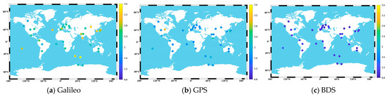 According to Figure 2 and Figure 3, the number of satellites in Galileo is eight, with the PDOP close to 2.4. In contrast, GPS has an average satellite count of 10 with a PDOP below 2, whereas BDS has the lowest position dilution of precision (PDOP) consistently; this is below 1.2 in the Asia–Pacific region, where it possesses a significantly higher number of available satellites. This is up to 12 due to differences in its satellite constellation design, operating altitude, and orbit inclination parameters compared to the BDS configuration. Consequently, BDS surpasses other systems in the Asia–Pacific region in terms of its satellite quantity and spatial distribution [].