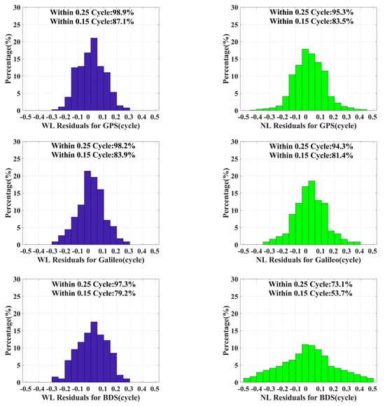 According to Figure 4, within ±0.25 cycles, GPS exhibits WL and NL residuals of 98.9% and 95.3%, respectively, while within ±0.15 cycles, these values are 87.1% and 83.5%, respectively. Moreover, the WL residuals for GPS within ±0.25 cycles are 98.2% and the NL residuals within ±0.25 cycles are 83.9%, while the NL residuals for GPS within ±0.15 cycles are observed to be approximately 81%. In general, the GPS residual distribution outperforms that of Galileo. This is due to the extensive RT tracking of GPS signals by receivers and the high quality of GPS orbit determination. However, due to the inadequate treatment of RT deviation products in BDS, both WL and NL residuals exhibit poor distribution characteristics. As shown in the figure, the WL residuals for BDS at the ±0.25 and ±0.15 cycles are 97.3% and 79.2%, respectively, while the NL residuals only reached 73.1% and 53.7%.