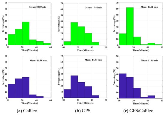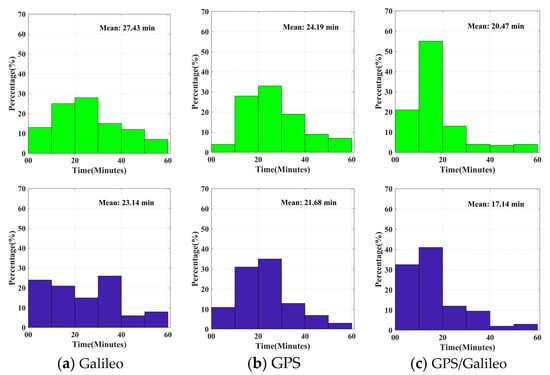 As depicted in Figure 6, the Galileo convergence time is the slowest in kinematic mode. In RT PPP, it takes approximately 27.43 min to converge, which reduces to 23.14 min after ambiguity resolution. Following Galileo, the GPS has a longer convergence time of approximately 24.19 min without ambiguity resolution, which decreases to 21.68 min after the ambiguity is resolved. On the other hand, the GPS/Galileo demonstrates the quickest convergence time, at approximately 20.47 min without ambiguity resolution and 17.14 min after ambiguity resolution. After ambiguity resolution, it becomes evident that the proportion of stations converging within 10 increases significantly. This indicates that ambiguity resolution increases the convergence time in kinematic mode intuitively.