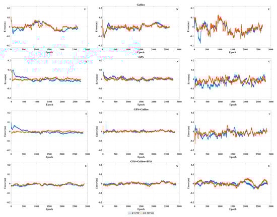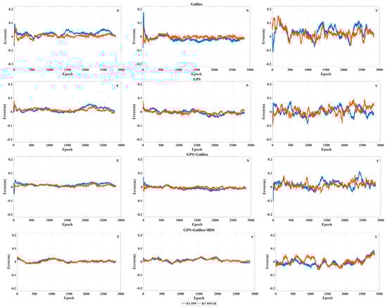 As shown in Figure 7 and Figure 8, for GRAZ stations, it can be clearly observed that the error fluctuation of the Galileo system in the E and U directions is significantly higher than that of GPS, but that the positioning accuracy of Galileo is significantly improved after AR processing. For GPS/Galileo, it can be observed that the accuracy of RT PPPAR is significantly better than RT PPP in the E direction, which shows that AR is very helpful with regard to improving the positioning accuracy. For HOLB stations, the RT PPP AR position error using GPS and the Galileo system decreases in both the E and N directions, and the time-series fluctuations become smoother as well. Despite the insignificant or even opposite performance in the U direction, the holistic position accuracy is still improved. Moreover, the GPS/Galileo is greater than that of a single system; however, significant fluctuations still persist. However, when BDS is incorporated into the combined positioning of all three systems, both the E and N direction fluctuations are significantly reduced, indicating enhanced stability and precision in the horizontal components.
