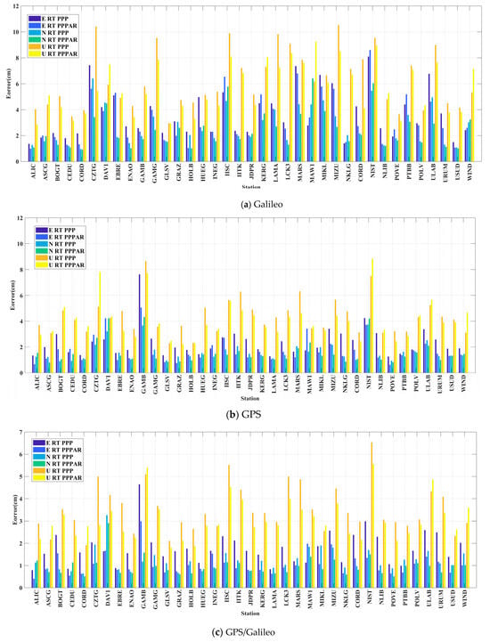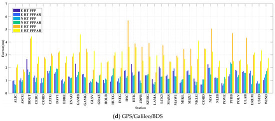 As shown in Figure 9a, 60% of the Galileo stations had improved localization accuracy in the E, N, U directions after PPPAR, and the U direction of the CZTG station had the best improvement effect, reaching 4.9 cm; in addition, the E, N, U directions of only three stations were worse after PPPAR, which may indicate that the same strategy is not practical for all the MGEX stations. It is clear in Figure 9b that, for the GPS system, 54% of the stations had an improved positioning accuracy in all three directions after PPPAR, while the N direction was significantly better than the E direction. A 2 cm improvement was observed in the E direction for the GAMB stations. In Figure 9c,d, it can be seen that regardless of whether GPS/Galileo or GPS/Galileo/BDS was used, the positioning accuracies in the E, N, U directions were significantly better than the GPS and Galileo systems, which is importantly related to the fact that multi-systems combine a large number of satellites and a good satellite spatial geometric configuration. However, the positioning accuracy of GPS/Galileo/BDS in RT PPPAR was worse than that of GPS/Galileo in the both the E direction and U direction, which is very much related to the poor solving of the BDS-phase deviation products.
