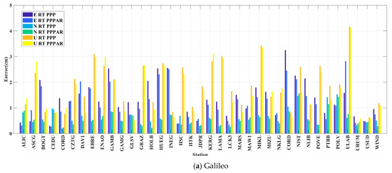 From Figure 10a, it can be seen that for the Galileo system, all the stations improved in one or more directions in E, N and U. It is also clear that 78% of the stations improved in the E direction and 59% and 70% of the stations improved in the N and U directions. From Figure 10b, it can be seen that for the GPS system, after PPPAR, the improvement in the E direction was the best, followed by the U direction, and lastly the N direction, but that the positioning accuracy in the N direction was the best. The E direction of the HOLB station was improved by 0.7 cm, but the accuracy of the USUD station was reduced by 1.2 cm after PPPAR. From Figure 10c,d, it is evident that, no matter the RT PPP or RT PPPAR, the combination of multi-systems can still obviously improve the positional accuracy, although it is possible that the accuracy of individual stations is not as good as those without AR treatment after adding BDS. Although the accuracy of individual stations after PPPAR may not be as good as those without AR processing, the positioning accuracy after adding the BDS system is still better than that of GPS/Galileo.