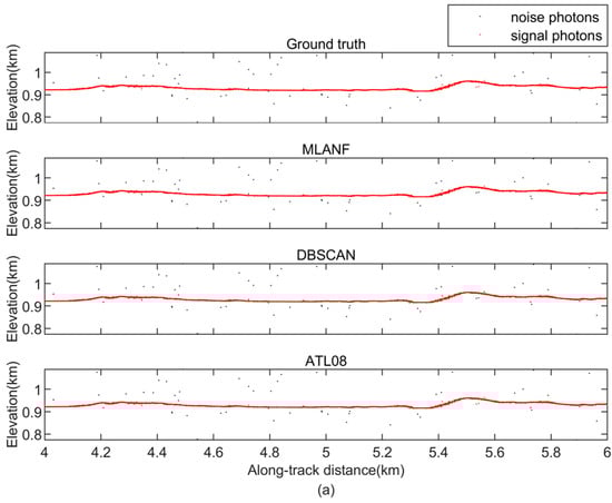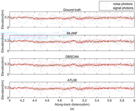 Figure 15 shows the denoising results of the TD dataset. This area has many ravines and no vegetation. Like the Sahara Desert data, the signal photons are distributed with less random noise. Three algorithms detect signal photons accurately. The DBSCAN and MLANF algorithms can obtain an excellent denoising effect. But some regions in the ATL08 data are missing signal photons. We show the detailed results of 6~8 km (green interval) and 12~14 km (yellow interval) in Figure 16. The signal photons in this region fit the ground surface and represent the shape of undulating dunes. The signal photons are far away from the noise photons and are easy to distinguish.