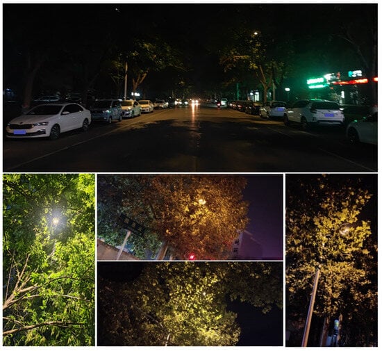 - Wang, X.D.; Wu, Y.; Wu, W.Z.; Han, X.; Cui, S.X.; Lu, W.N. Survey on Light Environment of Urban Roads and the Impacts of Street Trees—A Case Study of Ping’an Avenue in Zhengzhou City; Chinese Society of Landscape Architecture, Ed.; Chinese Society of Landscape Architecture: Beijing, China, 2020; pp. 430–435. [Google Scholar]