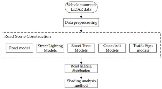In road scenes, there are numerous types and quantities of features, but the shading of street trees is the primary factor affecting streetlight illumination, especially when streetlights intersect with the branches and leaves of street trees, severely impacting the lighting effect. Some taller shrubs in the green belts can also affect the lighting to some extent, while other features such as traffic signs have a limited impact on streetlight illumination. In order to more accurately reflect the streetlight illumination conditions in road scenes, this study is based on vehicle-mounted LiDAR point clouds to finely model the road surface, streetlights, street trees, green belts, and traffic signs, thereby establishing a realistic road scene as the foundation for accurate streetlight illumination analysis.