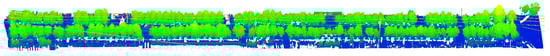 The experiment uses the SSW-3 type vehicle-mounted laser scanning system to acquire road point cloud data. This system highly integrates the laser scanner, laser gyroscope, high-precision GNSS receiver, panoramic camera, and odometer, boasting advantages such as high acquisition precision and fast speed. The test area is located on a section of Yuxi Road in Jiaozuo City, Henan Province, with a total length of 500 m, 23 streetlights, and several street trees. The trees on both sides of the road are tall and dense, with large crowns. Some of the trees severely obstruct the streetlights, significantly affecting their illumination, posing safety risks for pedestrians and vehicles traveling at night. The point cloud data of the experimental area roads are as shown in Figure 3.