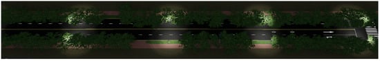 This paper employed the Lumion platform to construct a three-dimensional visual scene for road lighting. The constructed models were imported into a database, and the road scene was built following the sequence of the road surface, streetlights, traffic signs, greenery zones, and street trees, as depicted in Figure 9. Since each model was constructed based on point cloud data that had undergone zero-normalization, this ensured the consistency of the spatial relationships between the models. By using the parameter information from the streetlight models, streetlight sources were added, allowing for the realistic representation of the road lighting scene, as shown in Figure 10.