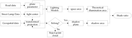 Based on the road scene point cloud data and streetlight parameters, calculate the theoretical illuminated area of streetlights and the road surface shadow area formed by object occlusion. Figure 12 is the flowchart of occlusion calculation.