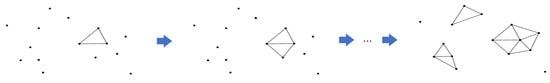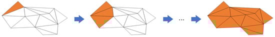Based on the plane region determined by the point cloud set Q, the projection points of the occlusions in the theoretical illumination area are indexed. Calculate the side length threshold T based on the point cloud granularity value and projection ratio. The spatial region-growing algorithm based on Delaunay (Figure 13) selects a sample triangle as the initial surface. It continuously expands the boundary of the triangulated mesh until no triangles are generated with an edge length below the threshold Tshadow. All points within the triangulated mesh are marked. Then, in the unmarked point cloud, the process is repeated until there are no triangles formed by three points in the projected points that meet the edge length threshold Tshadow. Finally, all the generated triangular mesh planes represent the shadowed area of streetlights obscured by roadside trees.