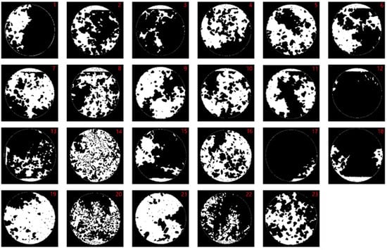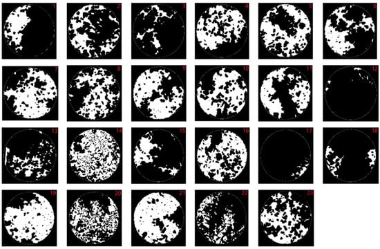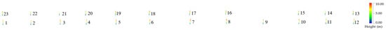 The author aims to analyze the occlusion relationship between street trees and streetlights in road scenes based on vehicle-mounted LiDAR technology. First, we assigned numbers to the streetlight point cloud data, as shown in Figure 16. We conducted simulations using relevant parameters, such as the height of streetlights, zenith angle, and beam angle, considering streetlights, street trees, ground point cloud data. We calculated the illuminated area on the ground in the absence of obstructions by streetlights and the shadow areas of various objects within the coverage of streetlight illumination. A single street lamp projected onto a plane appears as a circular light spot. Processing the data from all street lamps in the current experimental area produces a light spot map under each street lamp (Figure 17), visualizing how the illumination from street lamps is affected by the degree of obstruction from objects such as roadside trees, green belts, and traffic signs.