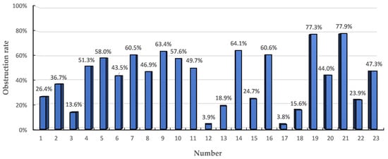 In this study, the average obstruction rate for streetlights in the research area due to objects is 42.1%. Among these obstructions, 48% fall into the category of moderate obstruction, while 28% are categorized as severe obstruction, as shown in Figure 23. Following on-site surveys and the collection of image data (Figure 24), it was observed that this section of the road experiences significant obstruction from street trees. This leads to an uneven distribution of road brightness, making the road overall relatively dark. The visibility is limited, and in some areas, nighttime blind spots are formed. This affects nighttime vehicles and pedestrians to varying degrees, and failing to address this issue promptly can result in significant safety hazards.