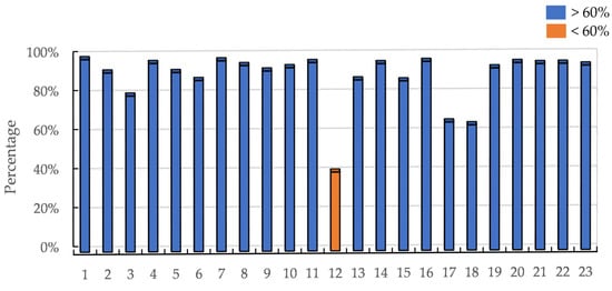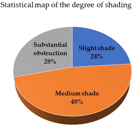 Through the analysis of streetlight obstruction data, street tree parameters, and shadow effect images, it is determined that the trees in the experimental area are primarily concentrated at a height of 12 m or above, with crown diameters of 10 m. Due to the 10 m height of the streetlights, the lush foliage and substantial leaf thickness of these trees at this height are the primary factors leading to uneven road surface illuminance, mainly due to streetlight obstruction. Combining the proportions of tree shadows under different streetlights, as shown in Figure 21, it is found that for 87.0% of the streetlights, the shadows cast by street trees account for more than 80% of the total shadow below those streetlights.