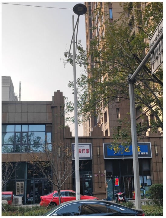 In particular, the obstruction conditions for streetlights 19 and 21 are notably severe, reaching 77.3% and 77.9%, respectively. Upon closer examination, it is observed that these streetlights are tightly enveloped by street trees, preventing the light beams from reaching the ground. The environment around streetlight 19 is depicted in Figure 20. To prevent potential traffic accidents, timely repair and maintenance are required in such situations.