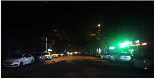- Under different lighting conditions, data on participants’ perceived safety during passing are collected. A spatial physical model is constructed based on streetlight parameters, with a focus on analyzing the comfort and safety of nighttime travel due to lighting []. Poor road lighting at night is due to the influence of surrounding objects (Figure 1). Additionally, accident rates are analyzed, and the degree of injury in two-lane intersection accidents is examined with regard to the impact of lighting [].