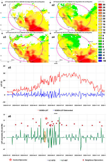 This study aims at calculating and detecting earthquake LST anomalies using the STD and IQT methods in time series data [13] from the advanced baseline imager (ABI) [14] on GOES and from MODIS [15] on the AQUA satellite to inspect if any occurrence of LST anomalies before large, land-based earthquakes are detectable [19]. Only the data measured between midnight and 6:00 am local time are used to mitigate the diurnal cycle. The essential advantage of using multi-satellite data sources is the capability to generate accurate global and gap-free LST maps by data fusion of ABI/GOES 16 and 17, as explained in Section 2.1 (Step 4). Furthermore, earthquake events with a shock magnitude (Mw) larger than 4 have been studied globally during the year 2020. A few days or weeks before the seismic shocks, the LST anomaly of the pixels around the epicenters can be up to 1 °C to 4 °C [18]. This result is understood as the Earth’s crust’s thermal flux in seismically dynamic parts [20].