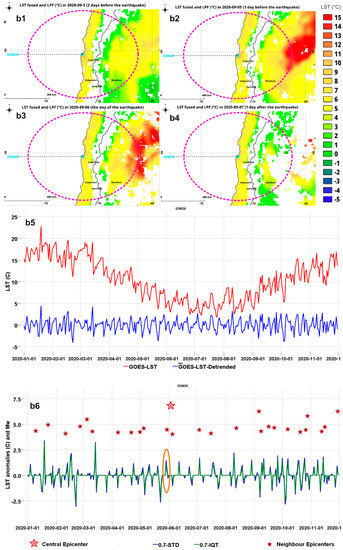 Figure 4(b1–b6) show the analyzed, fused, and LPF LST around Coquimbo (Chile) between 3 and 7 September 2020. The epicenter is shown with a cyan star. Abnormal LST increments of 1 to 4 °C are detected around the epicenter, increasing to a maximum build-up of a thermal anomaly 2–4 days before the seismic events. Then, the LST anomaly cools down immediately after the earthquakes.