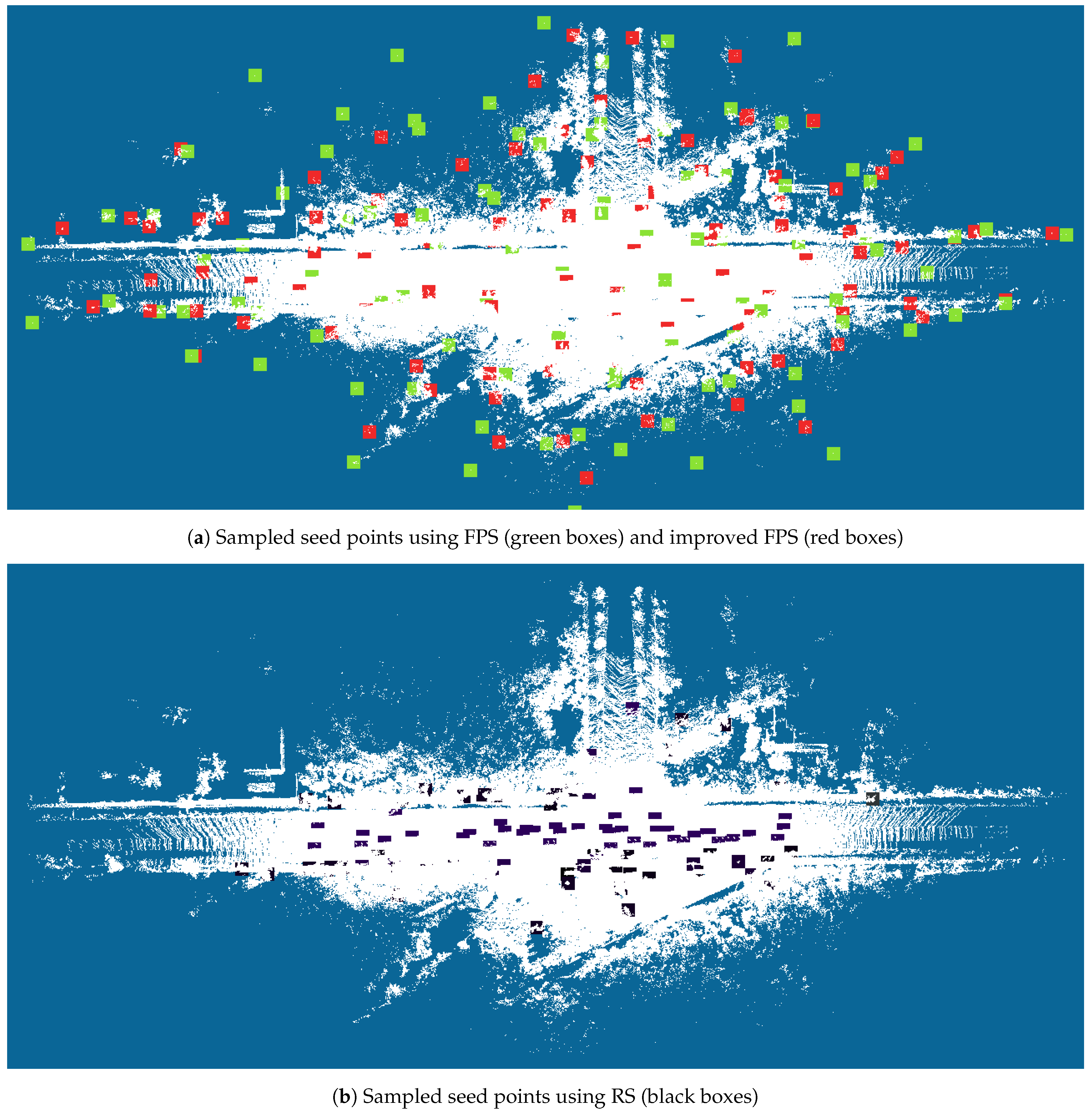 Figure 4. Comparison of FPS and improved FPS (a) and sampled seed points using RS (b) for Sequence 4.