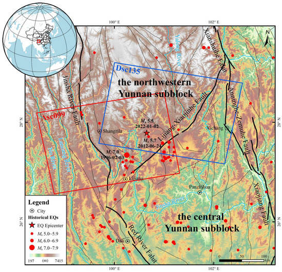 The historical earthquake distribution map of the northwestern Yunnan subblock to the central Yunnan subblock and neighboring areas. The faults are based on the “Active Tectonic Map of China (1:4 million)” []. Historical earthquakes are from CENC’s catalogue of earthquakes greater than 5.0 magnitude from 1970 to the present. The base map is NASADEM from Earthdata [].