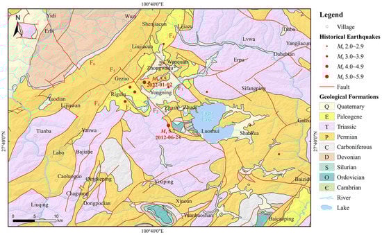 The oldest strata exposed in the area include the Cambrian (Є) siltstone, shale sandwich tuff, flint nodule tuff, and dolomitic tuff, which are distributed in the western part of Yuanbaoshan (Figure 2). Except for the absence of Jurassic and Cretaceous strata, the Ordovician (O) to Quaternary (Q) strata are distributed in the area. Near the epicenter, there are mainly Quaternary alluvium, floodplain, lacustrine, and slope deposits (Qh), three and four sections (E2n4 and E2n3) of the Paleocene Ninglang Formation. Especially, the lithologies of the third and fourth sections of the Ninglang Formation are conglomerate and miscellaneous mudstone intercalated with marl with purple–red conglomerate and sandstone intercalated with sandstone and mudstone, respectively. In addition, there are sandstones and sunken conglomerates intercalated with tuffs and coal lines of the Permian Heinishao Formation (P2h), basalt intercalated with tuffs of the Permian Nieertangdao Formation (P2n), and basalt intercalated with volcanic conglomerates intercalated with tuff lenses of the Yangjiaping Formation (P2y).