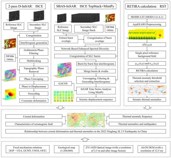In this study, the InSAR technique was combined with RST. The ascending and descending Sentinel-1A SAR data (the range is shown in Figure 1) and the nighttime Moderate Resolution Imaging Spectroradiometer Land Surface Temperature (MODIS LST) data were selected. From this data, the coseismic deformation field of the 2022 Ninglang Ms 5.5 earthquake was obtained by D-InSAR, and the crustal deformation before and after the earthquake was obtained by SBAS-InSAR. Meanwhile, the thermal anomalies before and after the earthquake were extracted by RST. Then, combined with the regional geotectonic background and the solution of the seismic mechanism from related institutions, the coupling relationship between the InSAR crustal deformation and seismic thermal anomalies of the Ninglang earthquake was investigated. Finally, the macroscopic epicenter location, coseismic characteristics, and possible seismogenic ruptures of the 2022 Ninglang earthquake were further revealed.