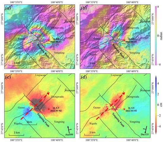 The coseismic deformation field of 2022 Ninglang earthquake: (a) the ascending orbit interference fringe; (b) the descending orbit interference fringe; (c) the ascending orbit LOS deformation; (d) the descending orbit LOS deformation; The red star is the location of the epicenter given by the CENC. The red dashed arrow shows the location of the profile in Figure 5.