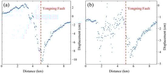 (a) the coseismic deformation profile of the ascending orbit; (b) the coseismic deformation profile of the descending orbit.