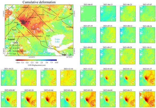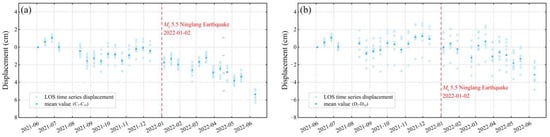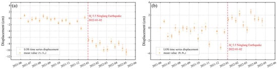 To analyze the change law of the seismic displacement field with time, 20 points on both sides of the epicenter deformation zone in the pre- and post-earthquake displacement sequences of the ascending orbit InSAR (Figure 6), were selected to analyze their deformation time series (Figure 7a,b). A1–A10 are locate in the northeast subsidence area, and B1–B10 are locate in the southwest uplift area. After the earthquake (after 2 January 2022), the displacement field of the northeast side of the deformation field showed subsidence, and the southwest side showed an uplift. It can be seen from the obtained time series displacement field that the displacement had a clear phase with the earthquake occurrence: the region was basically in a state of small and slow deformation with small cumulative deformation from 1 June 2021 to 22 December 2021. The maximum accumulated deformation was about −3.53 cm, which is the pre-earthquake creeping displacement. From 22 December 2021 to 3 January 2022, across the epicenter moment, the deformation around the epicenter increased abruptly. The maximum value exceeded −7.27 cm, and the displacement changed rapidly and abruptly. After the earthquake on 3 January 2022, the deformation slowed down significantly, and the deformation continued to occur under the influence of small and medium-sized earthquakes on 5 January and April 2022. In the region, points A1–A10 showed a general downward trend, points B1–B10 showed a general upward trend, and all other points showed similar deformation trends.