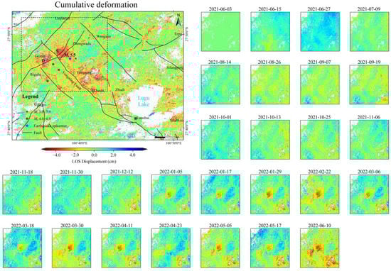 The SBAS-InSAR time series analysis of the interferometric pairs preprocessed by the ISCE TopStack was performed by using MintPy. The first view of the ascending and descending orbits image is taken as the baseline without deformation, where the ascending orbit is 1 June 2021, and the descending orbit is 3 June 2021. Then, the displacement field change process before and after the Ninglang earthquake and its deformation characteristics associated with the seismogenic rupture in the region at different stages were obtained.