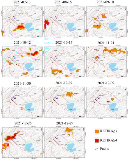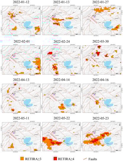 A total of 2431 images of MODIS LST data over a 10-year period (i.e., 2013–2022) were selected by pre-screening and filtering images with more than 80% cloud cover for the calculation of μ∆t(x, y) and σ∆t(x, y) of the RETIRA index. Each cloud-free image contains 1794 pixels, and the cloud-covered pixels in the image are identified as “Nodata”. The final RETIRA index was calculated for 255 images from June 2021 to June 2022, with 16 images in June, 12 in July, 13 in August, 21 in September, 26 in October, 27 in November, 28 in December, 28 in January, 25 in February, 26 in March, 17 in April, and 16 in May. A higher relative deviation threshold (RETIRA ≥ 3) was adopted, and a total of 23 anomalies were extracted before and after the earthquake.