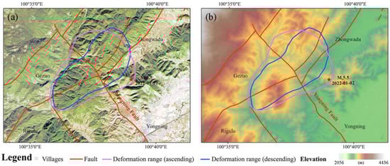 According to the characteristics of radar imaging geometry, the surface displacement in the LOS direction is a vector synthesis of the surface deformation in the north–south, east–west, and vertical directions projected in the LOS direction, respectively. For both uplifted and downgraded tracks, surface vertical deformation contributes to above 90% of the LOS-direction observations []. InSAR is most sensitive to the vertical deformation of the fault, and in terms of the coseismic deformation and the displacement field, the deformation is mainly dominated by subsidence before and after the earthquake. This is corroborated by the trend of the ascending and descending orbit deformation profile lines (Figure 5), showing the surface deformation caused by positive-fault type earthquakes. After superimposing the extent of the coseismic deformation zone on the remote sensing image with a resolution of 2.5 m of the resource satellite ZY-1 02D and Advanced Land Observing Satellite-1 DEM (ALOS DEM) with a resolution of 12.5 m, it can be seen that the deformation is mainly located in the northwest section of the Yongning Fault (Figure 12a,b). As the basin-controlling fault of the Yongning Basin, the Yongning Fault shows a straight linear extension with obvious topographic elevation differences on both sides, and steeply standing fault cliffs can be observed in the area from Yongning Town to Chenjiawan.