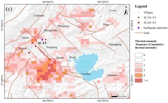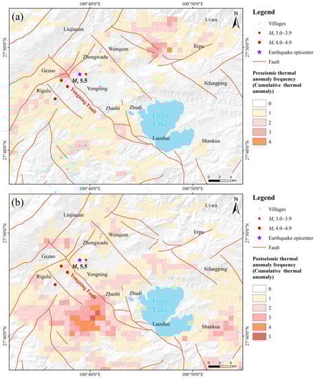 The preseismic thermal anomaly frequency ranges from 1 to 4 (Figure 13a) and is mainly distributed near the epicenter and its surrounding ruptures, especially in the northeastern part of Erpu. The postseismic thermal anomaly frequency ranges from 1 to 5 (Figure 13b) and thermal anomalies are mainly distributed in the southern part of the epicenter, the southwest side of the Yongning Fault, and some areas on the east side of Lugu Lake. The areas with the highest frequency of thermal anomalies before and after the earthquake are the western part of Erpu and the southwestern part of Zhashi, respectively, and there are certain common areas. After the Ms 5.5 earthquake on 2 January, four more earthquakes of magnitude 3~5 occurred in the region in April. The change in the concentration area of thermal anomalies may indicate that the post-earthquake thermal anomalies extracted for 12 days were associated with different earthquakes, superimposed on the pre-earthquake thermal anomalies in April, and that the earthquakes in January and April were independent of each other.