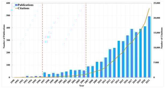 The trend of the amount of academic literature in this field over time can effectively show the state of research and further predict its development trends []. The number of publications and citations of remote sensing-based glacier mass balance studies from 1990 to 2021 over time are shown in Figure 1. There are three stages according to the time series. From 1990 to 1996, the annual publications were less than 10 articles, indicating research in this field that was at a low level and was not sufficiently active to be taken seriously. From 1997 to 2006, the publications were between 30 and 95, and this has been increasing rapidly each year since 2007. From the overall view, the literature volume showed a near-exponential growth trend. According to Price, if the number of works in a certain research field shows an exponential growth trend, it indicates that the development trend of the field is not yet saturated, but is still in a period of rapid development where new theories, new methods, and new technologies will emerge continuously [].