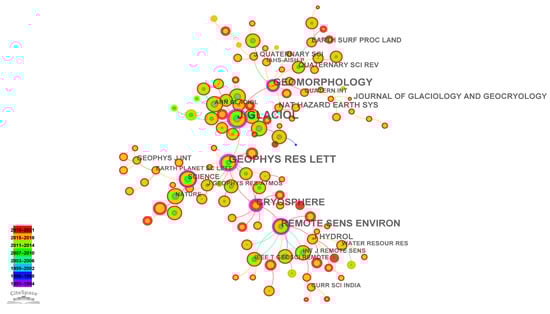 Two journals being cited by the same literature is known as journal co-citation []. Journal co-citation analysis allows for the positioning and classification of journals and the identification of their core or marginal position in the discipline. Figure 2 displays the journal co-citation network of this research. It can be seen from Table 2, the Journal of Glaciology, Geophysical Research Letters, Science, Annals of Glaciology, Cryosphere, Remote Sensing of Environment, and Nature are the most frequently cited journals.