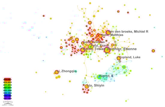 The concept of co-citation analysis was first introduced by Henry Small in 1973 []. When two documents appear together in the reference list of a third cited document, they form a co-citation relationship. The process of mining a collection of literature for co-citation relationships is called co-citation analysis. The higher the co-citation frequency, the closer they are to each other. Through statistical methods such as cluster analysis, multidimensional scale analysis, and factor analysis, the core authors in a subject area can be classified according to this “distance” and represented graphically to visually identify and analyze the scientific community in the subject area []. Table 4 lists the top 10 authors with citation frequencies above 500. It should be noted that in this analysis, only the first author is considered. Figure 4 shows the collaborative network of authors contributing to the field of glacier mass balance, which contains 427 nodes and 725 co-citation links. The most cited author was Rignot E (1069 citations), followed by Kääb A (928 citations). By comparing Table 4 to the authors listed in Table 3, we can see that Rignot E, Kääb A, Bolch T, Paul F, Berthier E, and Huss M appear in both tables, indicating that they are both the most prolific and influential authors. Rignot E is widely cited and has had a significant impact in the field, although he has published fewer papers than other authors. In the table, it can be seen that Rignot E and Kääb A have the largest centrality value, which indicates that their papers have been highly influential throughout the field of study.