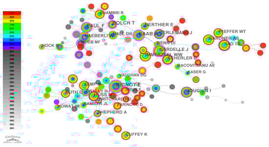 Knowledge map of author collaboration. Each node on the map symbolizes a different author, and the more articles they have produced, the larger the node. The connections between the nodes represent the collaboration between authors, and the thicker the line, the closer the collaboration [].